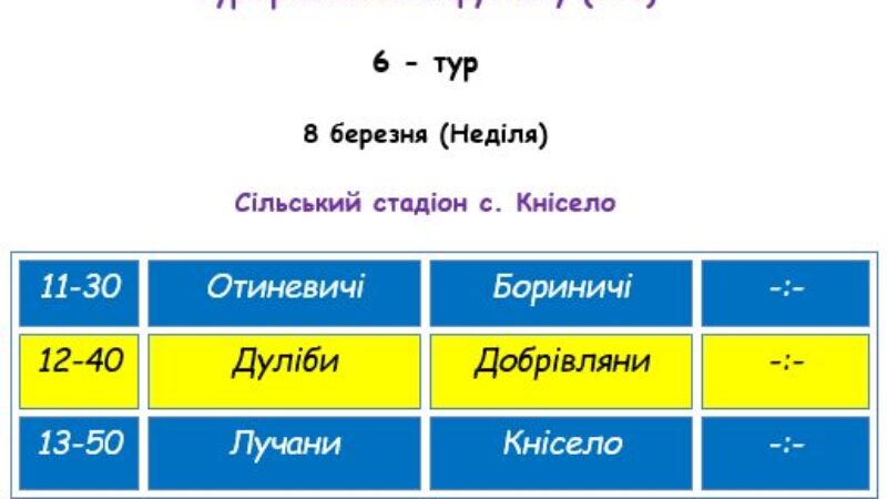 У неділю, 8 березня, на сільському стадіоні у Кніселі продовжаться змагання у межах Турніру із Зимового футболу (формат 7+1). Попри святковий день, на полі очікується безкомпромісна боротьба, адже команди виходять на фінішну пряму групового етапу.