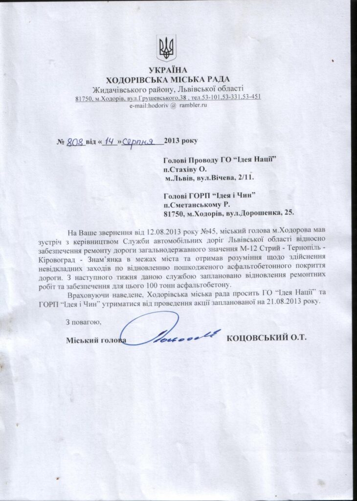 Враховуючи наведене. Ходорівська міська рада просить ГО “Ідея Нації та ГОРП “Ідея і Чин” утриматися від проведення акції запланованої на 21.08.2013 року.